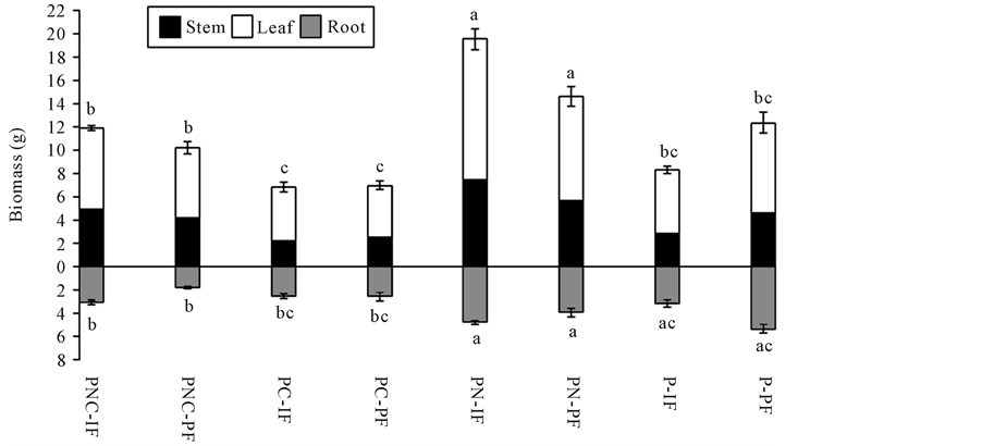 Treatments had also a significant effect on underground biomass production (p = 0.006), oiled treatment (PC, PNC) had significantly (p ≤ 0.05) lower root biomass (2.50 g, 2.50 g and 1.89 g, 3.09 g, respectively under IF and PF) than PN (4.83 g, 3.97 g) treatments (Figure 1). In absence of fertilizer, root biomass in oiled treatment was not significantly different from the non-oiled treatment (P).