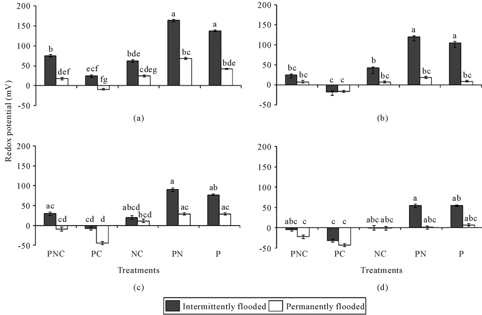 In sediments without crude oil, intermittently flooding conditions enhanced higher redox potentials in the top layer than permanently flooding conditions. However, in the microcosms with crude oil, the intermittently flooded conditions enhanced high redox values in the top layers, only in the treatments with plants and nutrients.