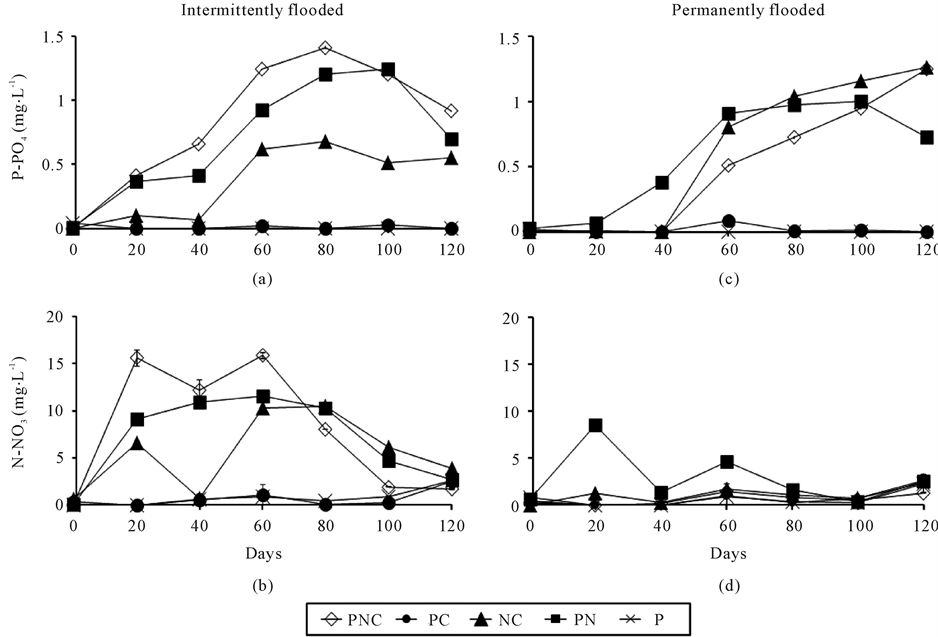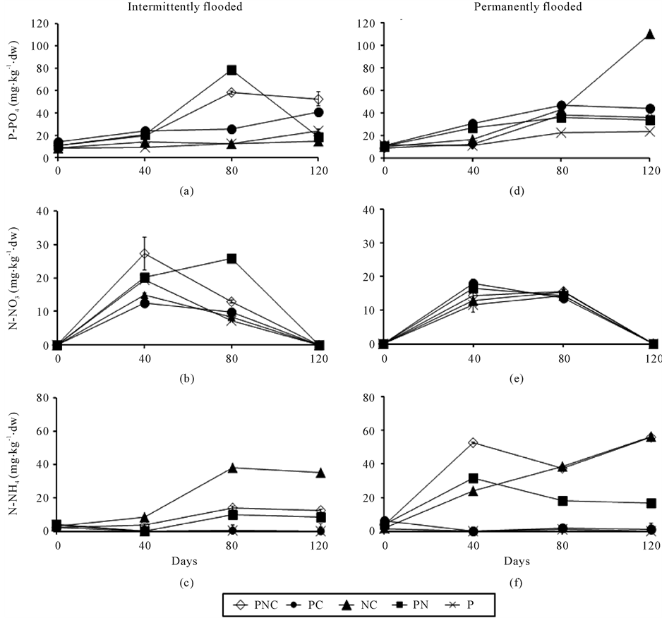 Under intermittent flooding conditions, an increase in nitrate concentration in microcosm soils in all treatments was observed, ranging from 10 to 30 mg∙kg−1 soil from day 0 to 80 then after 80 days the nitrate concentration decreased (Figure 3(b)). With permanent flooding condition, the nitrate concentration increased to 10 - 18 mg∙kg−1, and decreased after 80 days (Figure 3(e)).