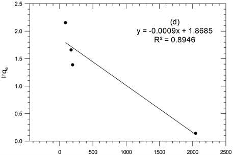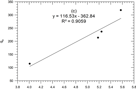 where: qm is maximum sorption capacity (mg/g); β is a activity coefficient constant related to sorption energy; ɛ is Polanyi potential. The DKR parameters are calculated from the slop of the plot of lnqe versus ε2 gives β (mol2/J2) and exp (intercept) gives qm (mg/g) in Figure 3(d) and listed in Table 2. The β gives the mean free energy (E) of sorption per molecule of the sorbate when it is transferred to the surface of the solid from infinity in the solution: