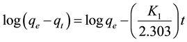 where: qe is the adsorption equilibrium capacity (mg/g), qt is the amount of Hg(II) adsorbed (mg/g) at time t, k1 is the rate constant of pseudo-first-order (min−1), q2 is the maximum adsorption capacity (mg/g) and k2 is the rate constant of pseudo-second-order (g/mg min) [16] . These parameters were obtained from slope and intercept of pseudo-first-order and pseudo-second-order plots between