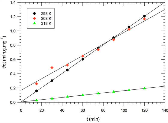 versus t and (t/qt) versus t [20] . Figure 4 shows pseudo-second-order plots for the Hg(II) adsorption onto ACROL surface and the kinetic parameters