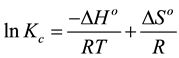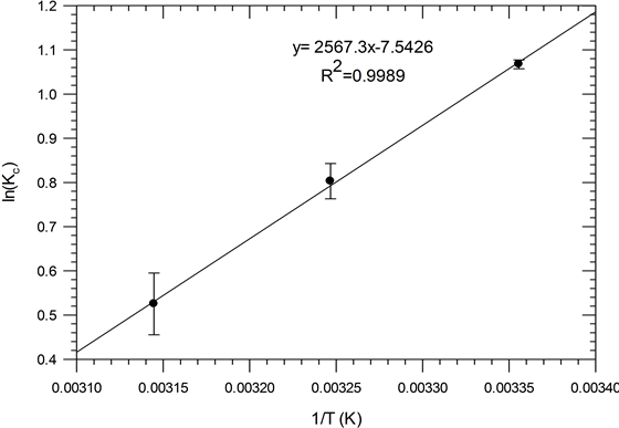 Thermodynamic parameters were estimated from van’t Hoff. A plot of lnKc versus 1/T (see Figure 5) was used to determine ∆Ho (= −slope. R) and ∆So (= intercept. R) from slope and intercept by following equation: