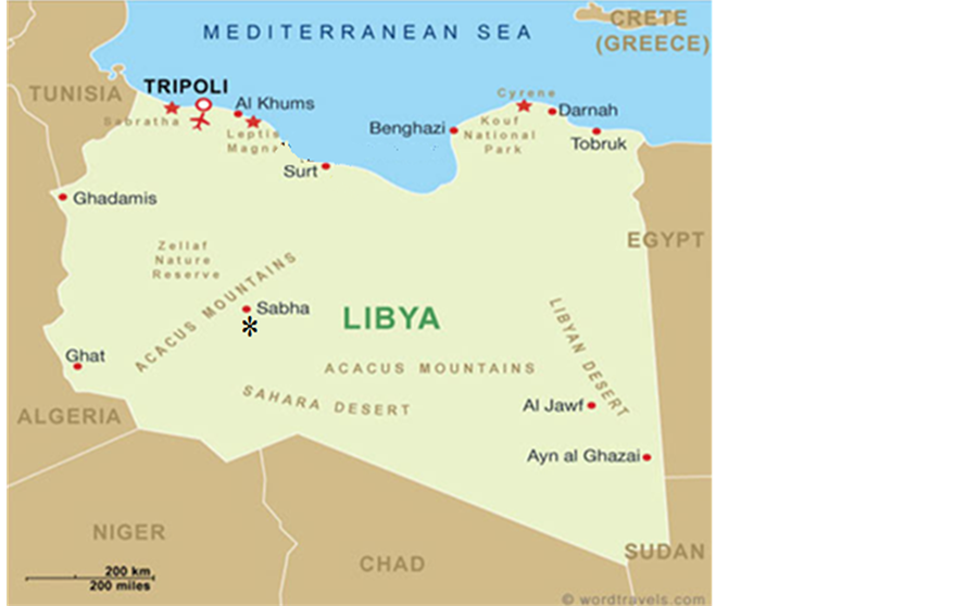 ACROL was collected from Sabha City, Libya (Figure 1) and washed with distilled water to remove fines and dirt. The raw sample was dried at 40˚C for 3 h, crushed and sieved to a particle size with 90 µm mesh and then was later immersed in diethyl ether for overnight until the solvents evaporated in order to remove the volatile oils. Then, it was placed in crucible and carbonized at 773 K for 1 h. The carbon produced was allowed to cool to room temperature for overnight, sieved again with 90 µm, put in an air tight bottle and stored in desiccators [12] .
