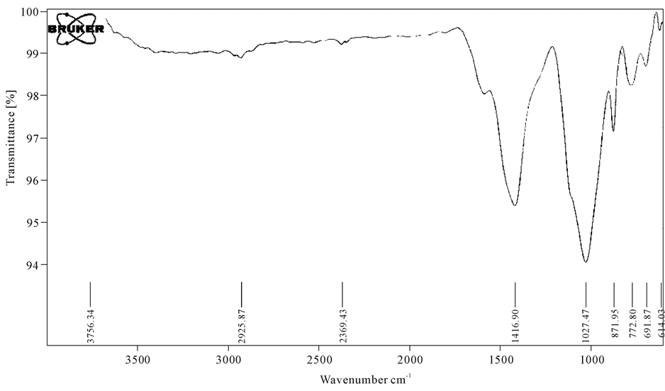 Fourier transform infrared (FT-IR) spectroscopy was used to evaluate the functional groups on the surface of ACROL within the range of 600 - 4000 cm−1, as shown in Figure 2. FT-IR measurement for ACROL showed the presence of the following groups: O-H stretching (a broad peak at 3756.34 cm−1), C-H stretching (a weak peak at 2925.87 cm−1), C=O (1690.03 cm−1), N-H (1416.90 cm−1) and C-N (1027.47 cm−1) [13] .