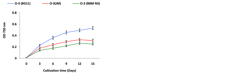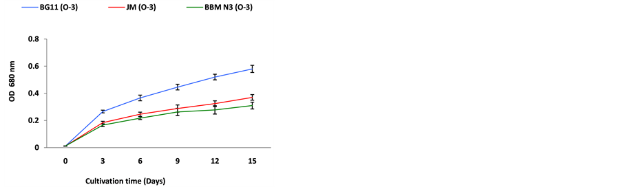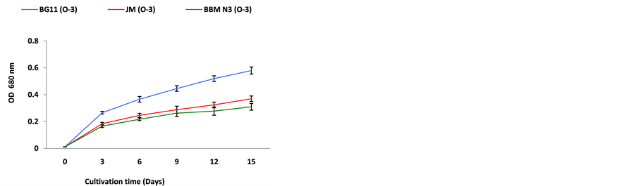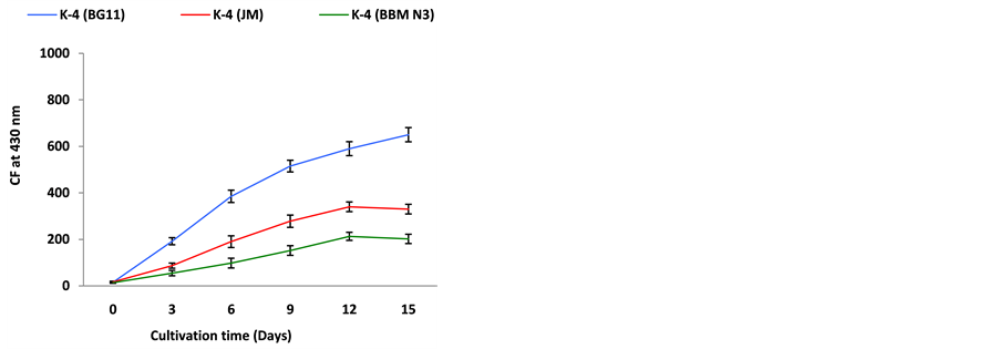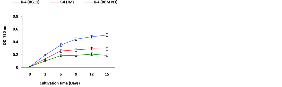 Growth measurement at an optical density of 680 nm, indicated that Kossou-4’s growth was greater in the BG11 medium than in other media. Figure 1(c), shows the sharp rise in the growth of Kossou-4 in BG11 medium at this O.D (680 nm) while the growth in the other two media were found to be similar but lower than was observed in BG11. There were significantly different results between all three media at day 15. The OD values at 680 nm in BG11 (0.56 nm) were 1.7-fold higher than in JM (0.33 nm) and 2.1 fold higher than in BBM-N3 medium (0.26 nm).