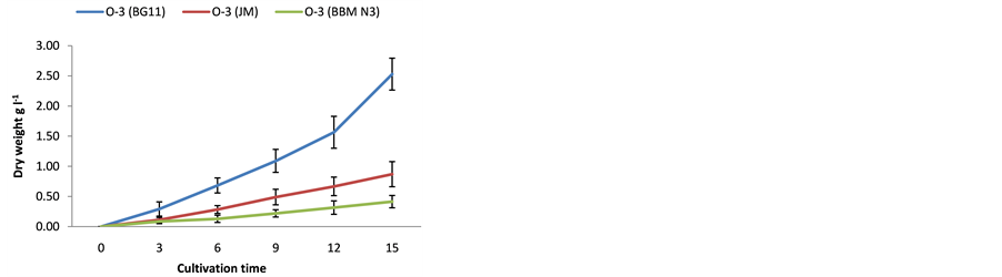 At day 15, the dry weight of Overjuyo-3 grown in the BG11 medium reached ~2.53 g∙L−1 compared with 0.87 g∙L−1 in the JM medium and 0.42 g∙L−1 in BBM 3N medium (Figure 1(b)). ANOVA for dry weight (mg∙L−1) at day 15 for Overjuyo-3 showed a significant difference between media.