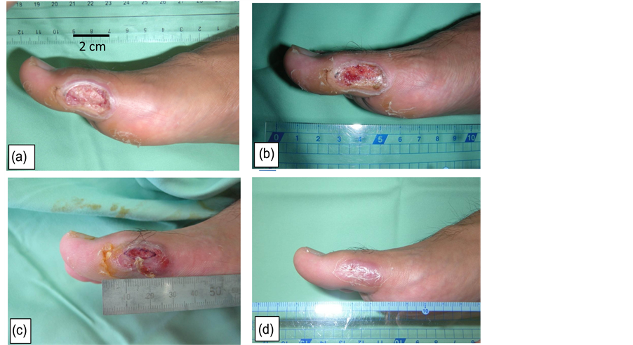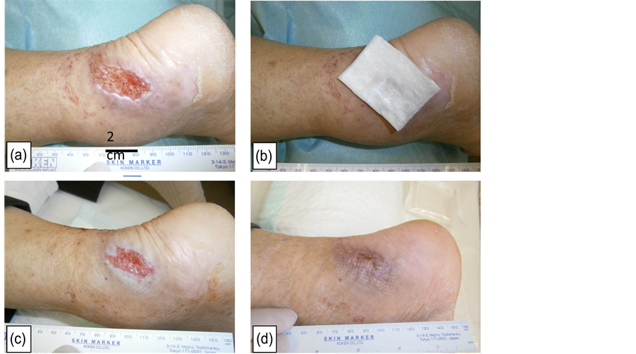 Case 1: A 64-year-old-woman with chronic renal failure developed a skin ulcer on the left leg. One month after receiving ointment therapy, the wound appeared as a hollowed ulcer with 3 × 1.8 cm in size (Figure 1(a)). After application of EGF-wound dressings twice a week on an outpatient basis, good granulation tissue formed and epithelialization was observed from the edge of the wound after 2 weeks (Figure 1(b)). Wound size was significantly smaller at 1 month (Figure 1(c)), and wound closure was achieved in 2 months (Figure 1(d)).