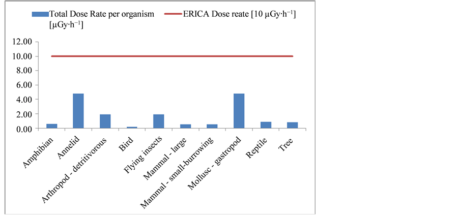 The results of the Tier 2 ERICA Tool run based on the data reported by Ibeanu [5] are presented in Figure 1. The models show very large variation among different groups in the predicted dose rates. The graph (Figure 1) indicates two threshold dose rate levels of interest. The first is the 10 µGy∙h−1 level that is considered of interest by those promoting the ERICA tool (e.g. Beresford, etc.); the ERICA universal dose rate is assumed for all ecosys-