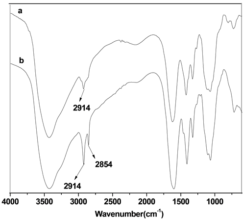 The structures of CMCS and CMCS-MUA were characterized by Fourier transformed infrared (FT-IR) spectroscopy and Proton nuclear magnetic resonance (1H NMR) spectroscopy. The FT-IR spectra of CMCS (see curve a) and CMCS-MUA (see curve b) are shown in Figure 2. For curve a in Figure 2, two absorption bands at 1417 cm−1 and 1600 cm−1 may be belonged to the asymmetric stretching vibration and symmetric stretching vibration of carbonyl respectively, which showed that CMCS was successfully prepared. Compared with curve a, a new characteristic band at 2854 cm−1 was observed in curve b, which was assigned to the asymmetric stretching vibration of C-S bond in CH2-SH. In addition, the intensity of the absorption band of -CH2- at 2914 cm−1 had increased significantly. These results indicated that MUA was successfully grafted to CMCS.
