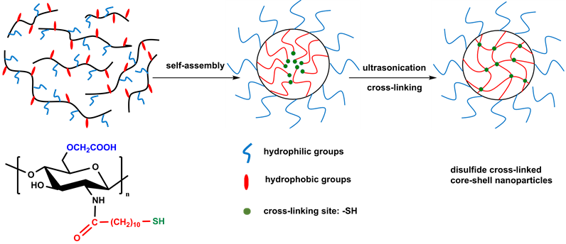 The prepared CMCS-MUA contains carboxyl groups and undecane chains which contribute to its amphiphilicity. Upon dispersing in aqueous solution, the undecane chains on CMCS-MUA tend to self-aggregate to form hydrophobic cores driven by hydrophobic interaction, and the hydrophilic segments with carboxyl groups tend