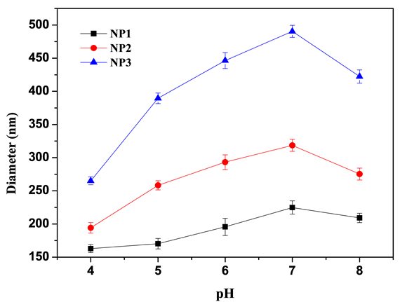 Additionally, it was also discovered that with the pH value increasing from 4.0 to 7.0, the diameters of three samples (NP1, NP2 and NP3) increased by 1.38, 1.64 and 1.85 times, respectively, and the extent of the change was decreased in the following order: NP3 > NP2 > NP1. This result may be ascribed to the cross-linking degree. The more MUA substitution the sample had, the more disulfide cross-linking bonds it could form, which resulted in a more compact structure, so the pH sensitivity decreased with the increase of the cross-linking degree.