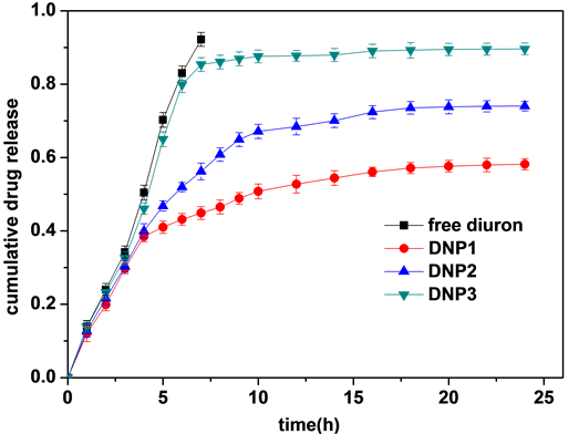 In vitro release behavior of DNP1, DNP2 and DNP3 in the same media (pH 7.0, PBS, 2 mM GSH) was also investigated according to the method above, and free diuron as a control was also used for this study.