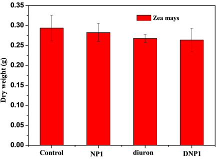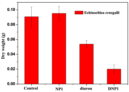 The herbicidal activity of DNP1, NP1, as well as free diuron, were investigated using two species, one a target species (Echinochloa crusgalli), and the other a nontarget species (Zea mays). The application concentration of diuron (equivalent to 3.0 kg/ha) was the same as that employed commercially in field crops.