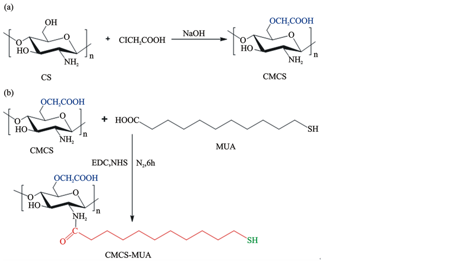 Figure 1. (a) Synthetic procedure of CMCS; (b) Synthetic procedure of CMCS-MUA.