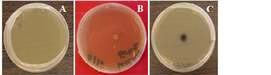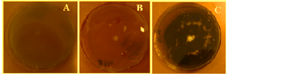 Figure 5. Laccase activity production by Tuber maculatum. (A) Control; (B) Tuber aestivum; (C) Tuber maculatum.