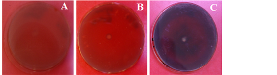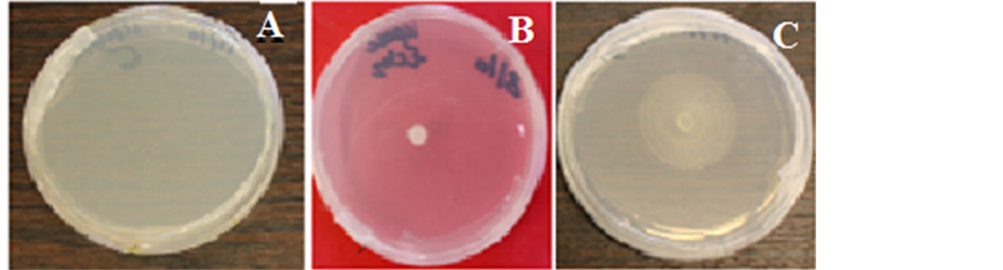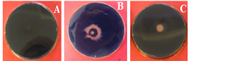 Figure 1. Comparison of amylase activity. (A) Control; (B) Tuber aestivum; (C) Tuber mac- ulatum the plates were flooded with 1% iodine in 2% potassium iodide. Formation of a clear zone surrounding the colony was considered as positive result for amylase production.
