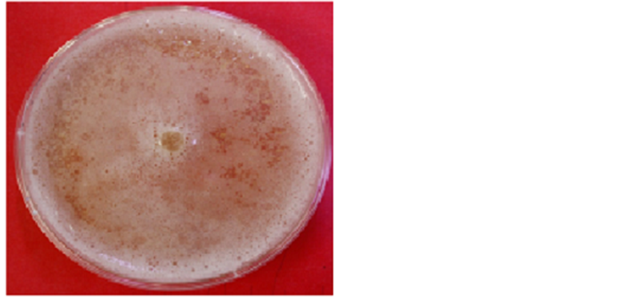 Laccase activity was determined by using Malt Extract Agar medium amended with 0.05 g/L 1-napthol. As the mycelia grows the colorless medium changes to blue due to oxidation of 1-naphthol by laccase enzyme.