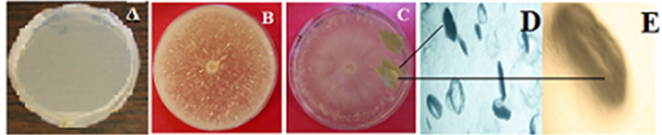 Figure 7. Xylanase enzyme production by Tuber maculatum. (A) Control; (B) Tuber aestivum; (C) Tuber maculatum the plates were flooded with Congo red solution (0.2%) and destained with 1 M NaCl solution. The plate was again incubated at room temperature for 15 minutes to obtain clear zone surrounding the colony, indicating xylanase activity.