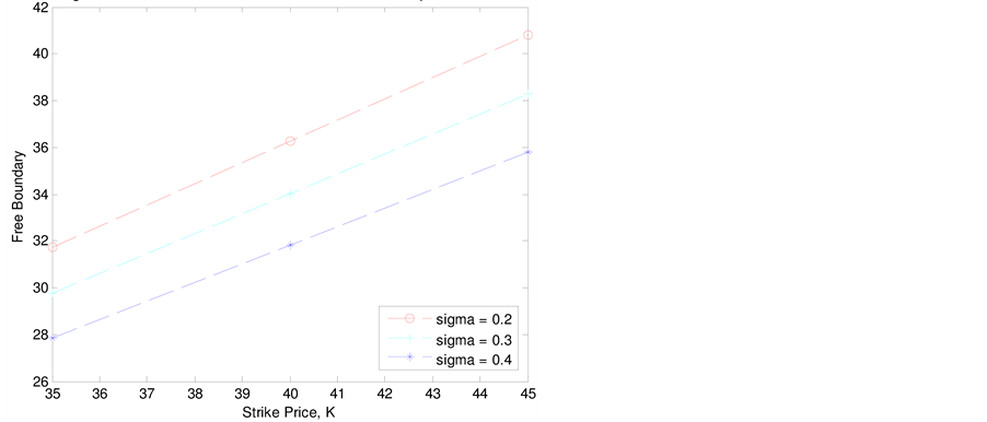 From Figure 1 below, we observe that the higher the volatility, the higher the values of the American power put option. Also the higher the power of the American put option, the lower the values of the option. Figures 2-4 below show that the Mellin transform method is mutually consistent, performs very well, accurate and agrees with the values of Black-Scholes model (BSM). In Figure 5 below, we plot the free boundary