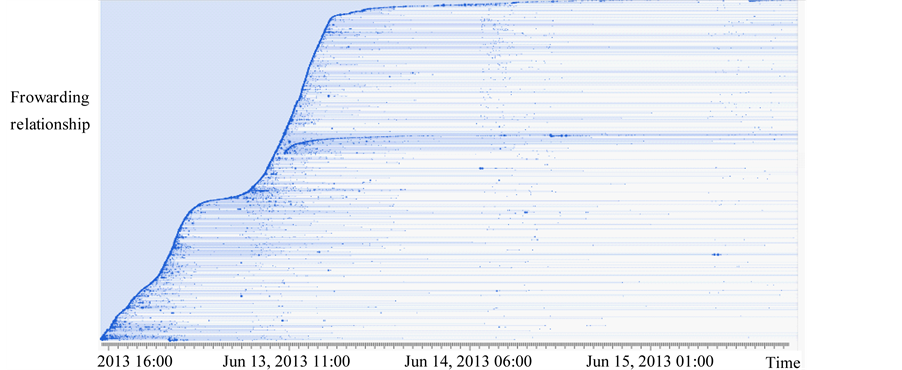 We used PKUVIS that is visual analysis tool to analyze the event and get Figure 2. Figure 2 is a sail view. In Figure 2, the horizontal axis is time, vertical axis is forwarding relationship. We can see that the most of the forwarding was concentrated in front of that time, almost in the first time a large number of forwarding was issued. The number of forwarding was getting smaller and smaller over time. This result is consistent with the conclusions above. In the end people would be out of discussion and were not involved in the discussion any more. But the impact of this event was very large. This incident has damaged the credibility of the local government. The farmers had a heavy price to be paid.