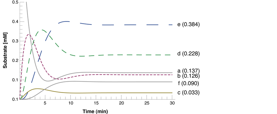 From the prefixed concentration values for each one of the substrates ((a) to (f)) and from a particular set of known kinetic constants, the rest of the kinetic constants were calculated (Table 2 and Table 4); a treatment similar to the above Example 2 was applied.