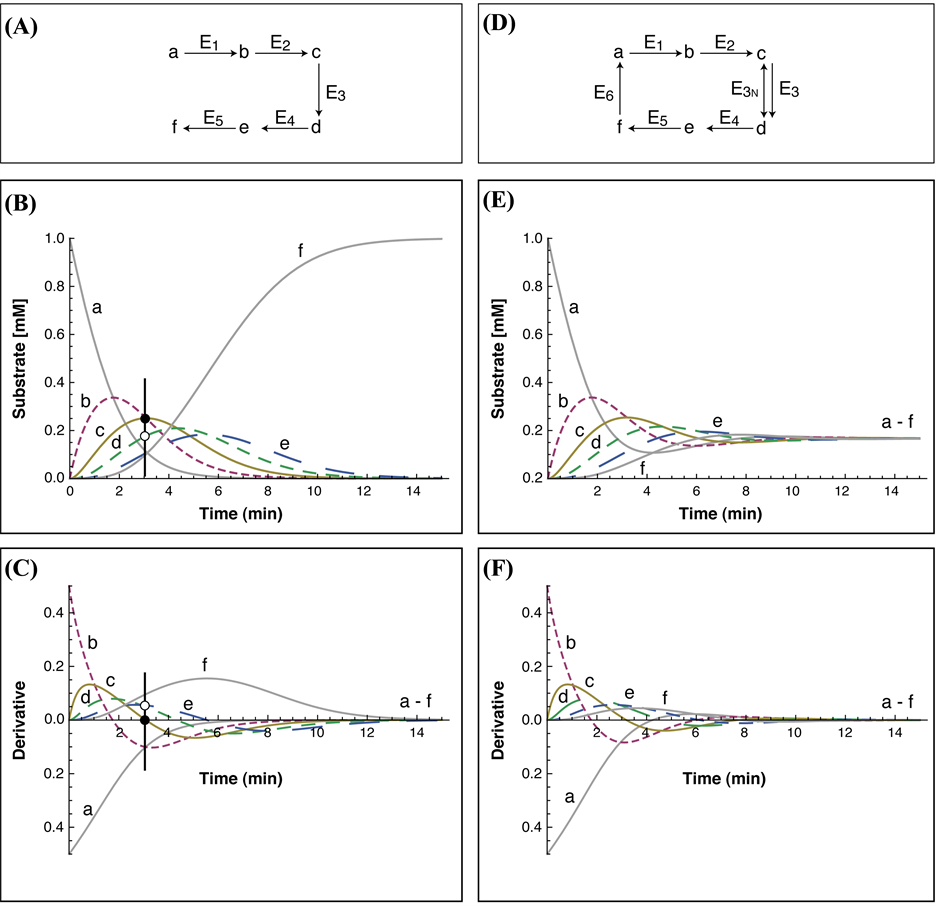Figure 1. Representation of an irreversible linear metabolic pathway (panels (A)-(C) and of a cyclic pathway (panels (D)- (F)). Panels (A) and (D) are schematic drawings of both types of pathways, composed by the same number of substrates (6), but different number of enzymes five or six, respectively. In panels (B) and (E), are the substrate profiles of the linear and cyclic pathways, respectively, obtained as described in the Table 1 (parts 1 + 2 + 3 + 4). In panels (C) and (F) are the derivatives of both profiles obtained as described in Table 1 (parts 1 + 2 + 3 + 5). In one case, as indicated in panel (D), the reaction between (c) and (d) was also considered catalyzed by a reversible enzyme (E3N). This particular case will be considered in Figure 2 (see also Table 4 and Table 7. The vertical line in panel (B) indicates exclusively its intersection with the profiles of substrates (c) and (b) (coincident full circle) and (d) (empty circle); the intersections in panel (C) are marked with full, empty circles, and an x sign for substrates (c), (d) and (b), respectively.