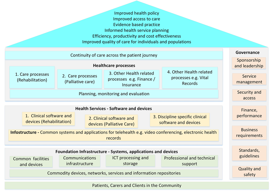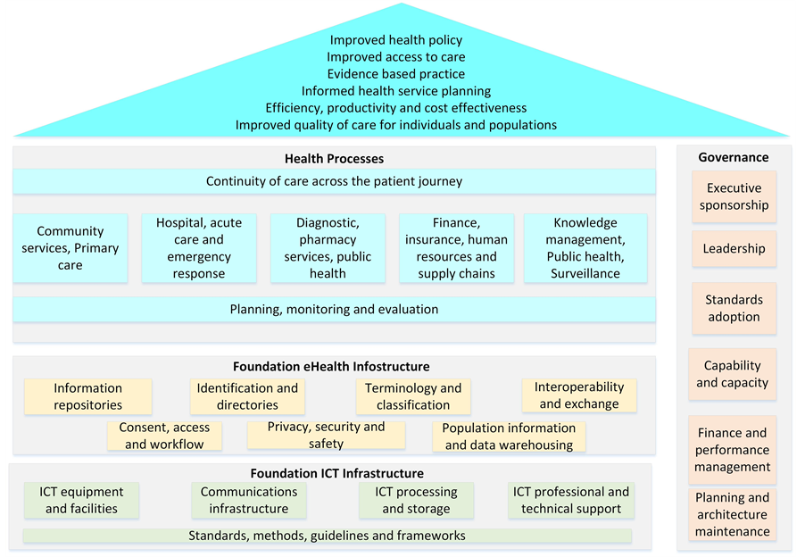 Governance and ownership is shown as the vertical bar on the far right of Figure 1. Governance and ownership are an important category of the eHealth architecture model since it represents the organizational and governance aspects of eHealth, including the financing, performance management and the development of local capability and capacity in health informatics. Standards are a key contributor to both infrastructure and infostructure.