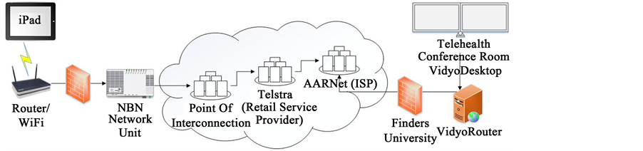 Rehabilitation and palliative care participants at home were provided with an Apple iPad with WiFi connectivity, and a NBN “ready” router with inbuilt WiFi. Where NBN connectivity was not available in a location, iPads with Telstra 3G/4G capabilities were loaned to participants to take home on discharge from hospital. The networking required in the home was quite simple; the primary device being used was an iPad with WiFi connectivity, and a router with inbuilt wireless IEEE 802.11 n provided connection to the internet. An NBN connection with a speed of 25 Mbps/5 Mbps was utilized as this allowed for the highest quality of video conferencing available on the video conferencing client.