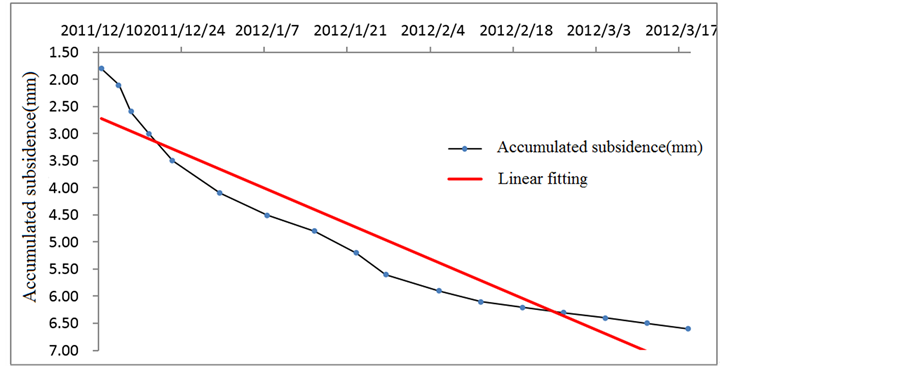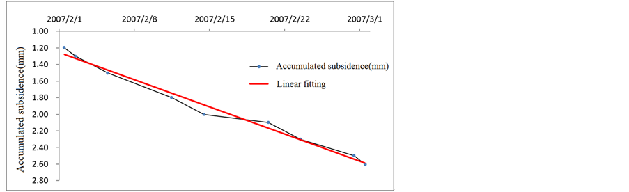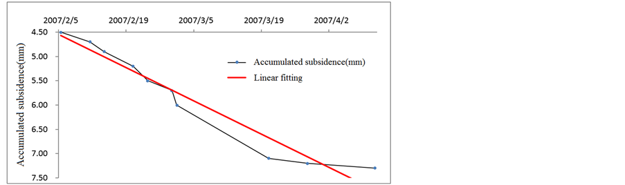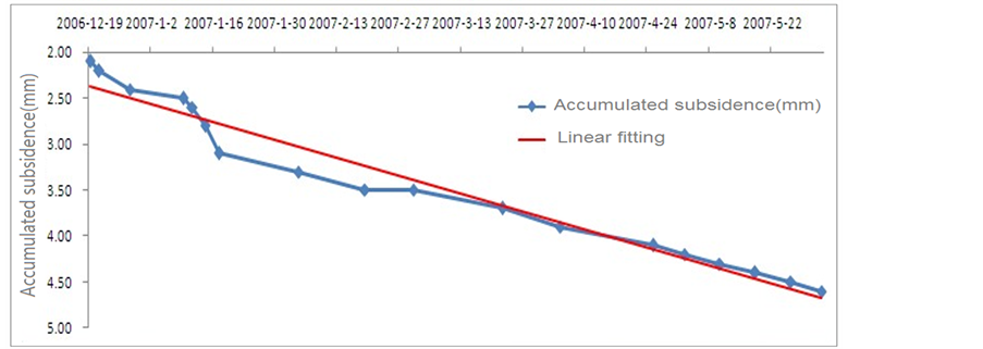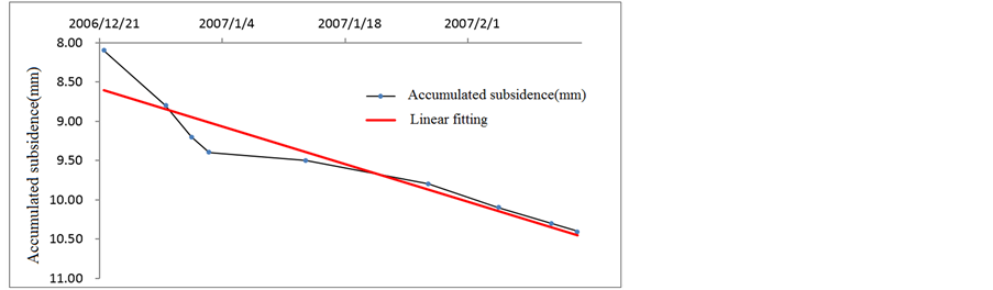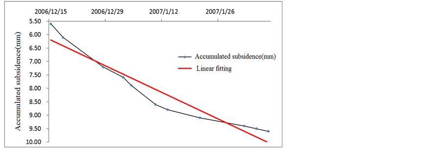 We next select the data for section 2, which is continuously within subsidence limits and whose developing trend is shown in Figure 6. An obvious linear tendency can be seen in Figures 1-5 illustrating developing trend of data groups exceeding limits. The subsidence limit of 15 mm can be quantized as the indexes given in Table 3. We see that a warning should be issued for subsidence of 0.3 mm weekly and 1.2 mm monthly.