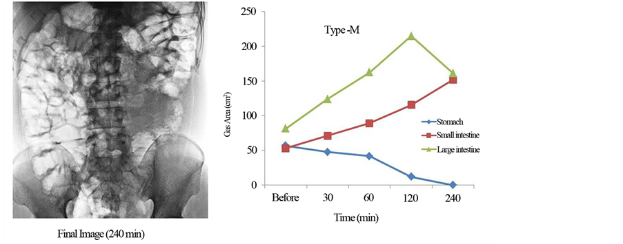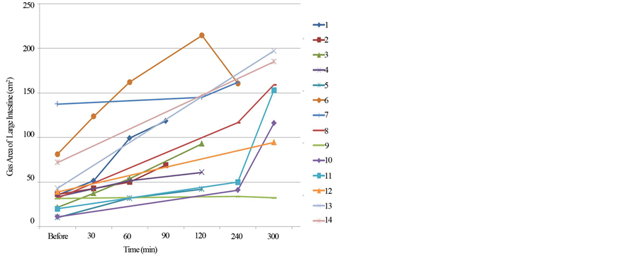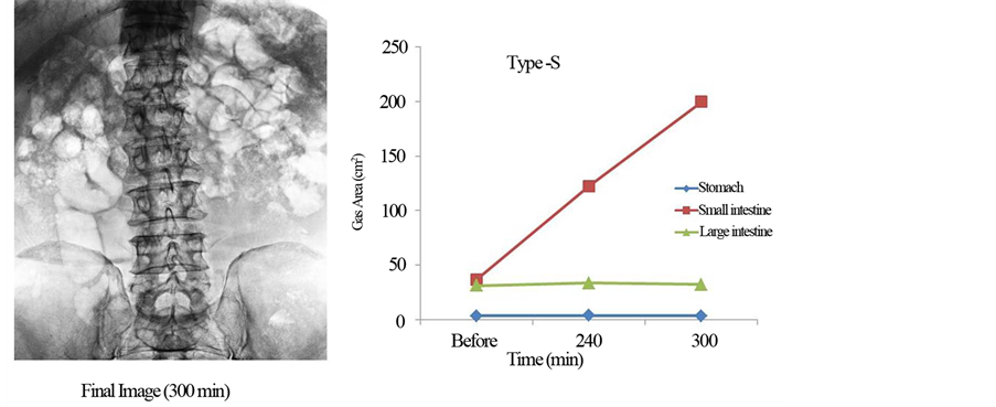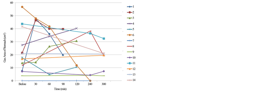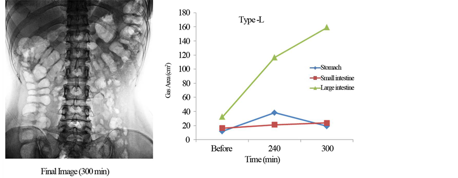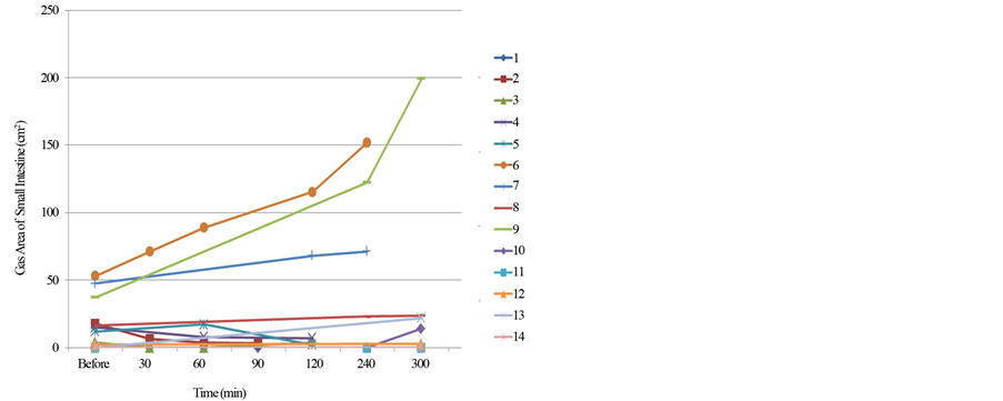 Some patterns were observed in the stomach, small intestine, and large intestine of the gas area (Figure 2 and Figure 3). The main pattern (Figure 3(a); Type-L; large intestine gas type) was increased gas (85.7%) in the large intestine in the absence of changes in the small intestine gas within a short time period. In Type-L, subtypes of increased stomach gas after 30 min and increased small intestinal gas after 300 minutes appeared in two patients. An additional two characteristic patterns were observed. Patient (patient 9) exhibited increased small intestinal gas without increased large intestinal gas (Figure 3(b); Type-S; small intestine gas type), or (patient 6) was increasing gas of both the large and small intestines (Figure 3(c); Type-M; mixed type). There was no specific regularity observed in the changes of the gas area in the stomach. Finally, comparison of the two methods of measurement, 10 g lactulose and observation over 120 min and 13 g lactulose and observation over 240 - 300 min (Figure 4), revealed that the latter approach was more effective in measuring changes in gas relative to the gas area present before the ingestion of lactulose (P = 0.01306 and P = 0.00108, respectively).