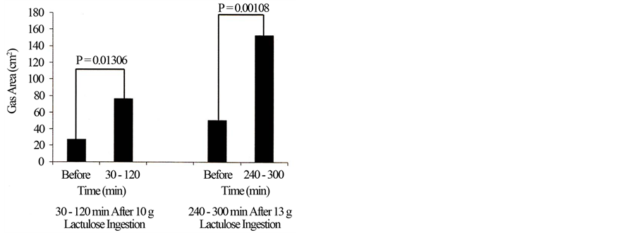 The major goal of the study was to compare gas measurements with 10 g lactulose and observation within 120 min to gas measurements with 13 g lactulose and observation of 240 - 300 minutes. For confirmation of the utility of the second measurement, P values, were determined by a two-tailed Student’s t-test (hazard ratio of 5%), when compared to the gas area before lactulose ingestion.