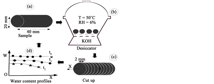 The experimental setup is constituted of a desiccator where the relative humidity is regulated at RH = 6% by a potassium hydroxide KOH solution (Figure 1). The cylindrical samples (Figure 1(a)) are put above the solution (Figure 1(b)) while the desiccator is placed in a thermo-regulated chamber (Memmert UFP 600) where the temperature is maintained at 50˚C.