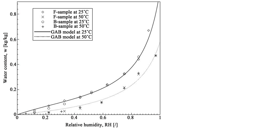 Desorption isotherm curves for both samples at 25˚C and 50˚C are represented in Figure 2. Theoretical modelling based on GAB description (Equation (3)) is also drawn while fitting parameters are given Table 2. The overall shape of curves is identical to those obtained by [11] with Spirulina platensis. The variation of desorption isotherm between 25˚C and 50˚C is similar to the one underlined with various food products such as banana, apple, coffee and pasta [18] [41] - [43] . It is noteworthy that the sorption behaviour is not sensitive to the geographical origin, i.e., both samples cultivated in different areas lead to nearly identical measures.