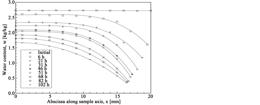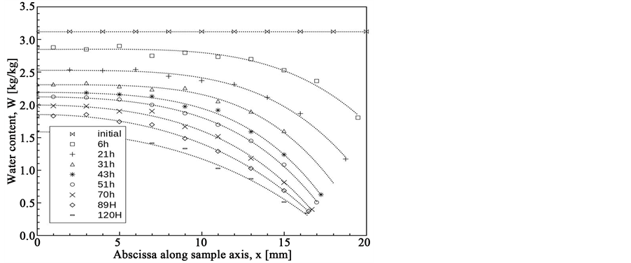 is determined by differential weighing after 48 hours drying at 70˚C for complete dehydration. Since samples and boundary conditions are symmetrical, the averaged water content of symmetrical points is considered. This methodology allows accessing to water content profiles