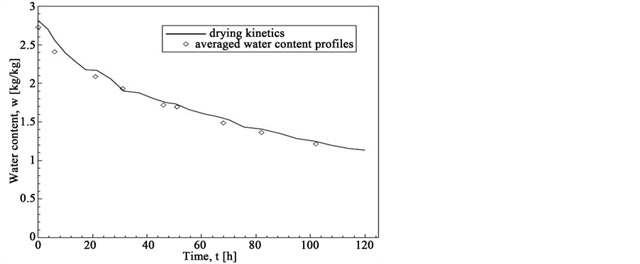 The drying kinetic obtained from continuous measurement is presented in Figure 5. The average water content values calculated from water content profiles have been added for comparison. The good agreement observed between both drying kinetics highlights that the destructive cutting method doesn’t cause perturbation of the profiles and that the influence of external conditions is negligible. So, we can consider that the water content profiles (Figure 3 and Figure 4) determined from different samples are representative of the evolution of a single sample.