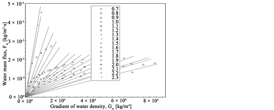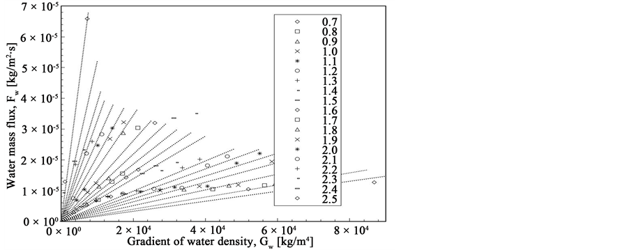 can be determined by applying the computational procedure described in previous section. Both quantities are represented in Figure 6 and Figure 7 for regularly distributed values of water content. For each water content value, a fairly linear correlation is observed between water flux and density gradient. Therefore, the water transport coefficient is determined from the slope of each linear approximation.