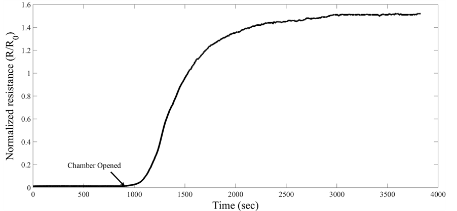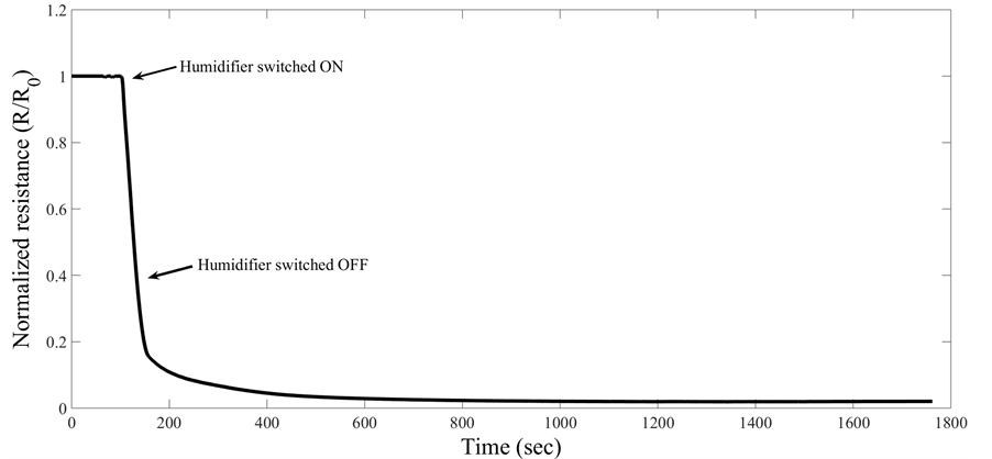 Hysteresis is an important parameter to characterize the performance of humidity sensors. To examine this characteristic in the GO device, two sets of cyclic experiments were carried out. In the first case, the humidity was cycled between 30% and 50%, and between 30% and 75% in the second case. Figure 8 and Figure 9 show the time response of the device for these cases, respectively. In each case, the following procedure was followed: 1) the humidifier was switched ON to increase the humidity in the chamber to the required level, 2) the resistance was recorded for increasing humidity for 1200 s, 3) the chamber opened to decrease the humidity to room conditions, 4) the resistance recorded for decreasing humidity for 1200 s. This procedure is repeated for the required number of cycles.