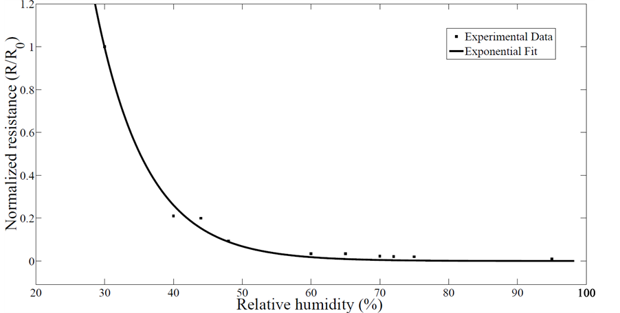 Experiments were conducted for various conditions, with humidity varying from 30% to 95%. Figure 7 shows a plot of resistance change as a function of RH. It is observed that the experimental data closely fits an exponential curve. Suri et al. define sensitivity S as the ratio of resistance before humidity exposure and at a given RH [33] . This does not take in to account the actual change in RH for a given change in resistance. We define sensitivity of the sensor S, as