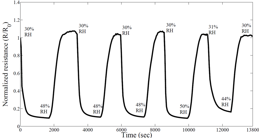 Figure 8 shows the time response of the device for humidity ranging from 30% to 50%. The sensing device shows high sensitivity, even for a 20% change in relative humidity. When the humidity is decreased to room conditions, the normalized resistance reaches ~1. This shows that there is weak interaction between the water molecules and the GO device for humidities < 50%. Water molecules are primarily adsorbed on the surface of GO, and hence the conductivity is dependent on water molecules on the GO surface. Most of the water molecules adsorbed on the GO surface are removed when the humidity is decreased to room conditions. When the experiment was cycled, similar trends in the resistance are observed. This demonstrated that the sensor response was highly reproducible at low humidities.