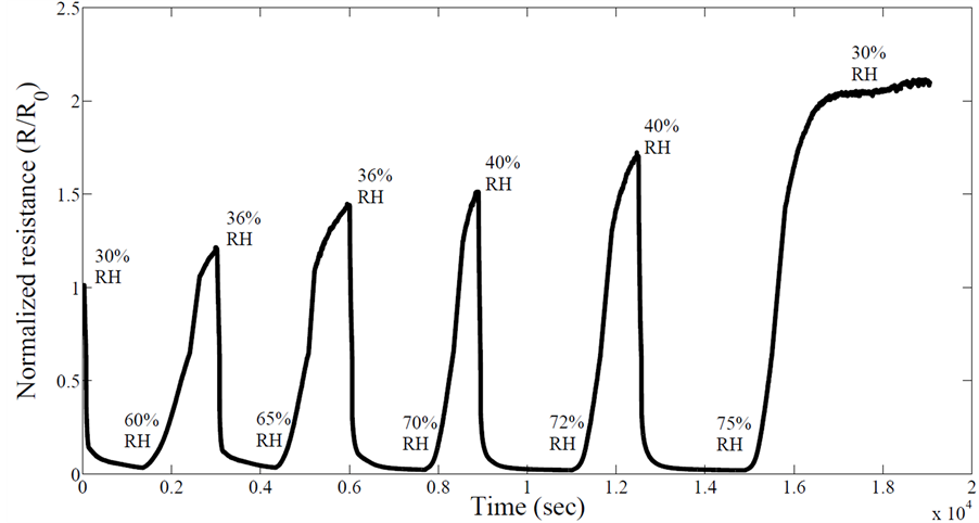 Similar cyclic experiments were done for humidity ranging from 30% to 75%, results of which are shown in Figure 9. Unlike in the case of low humidities, the normalized resistance increases above 1 when the chamber humidity is decreased to room conditions. This increase continues for every cycle completed between 30% and 75%. This can be attributed to water molecules getting absorbed into the GO thin film, entering the carbon interlayer, and forming bonds with the C-OH and C=O groups, resulting in an increase in interlayer spacing. This has also been speculated by Yao et al. [21] .
