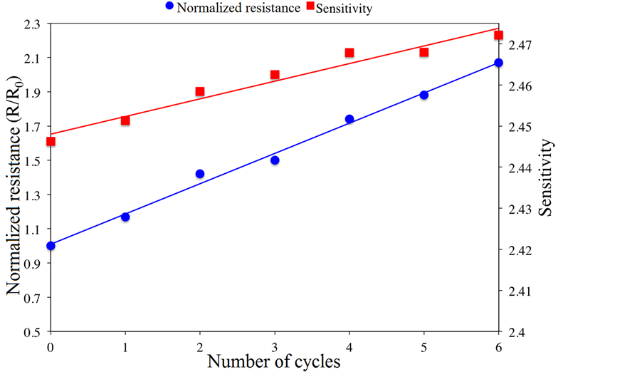 To study the increase in hysteresis as a function of the number of cycles, experiments were conducted where the RH was cycled between 30% and 70%. The resistance after absorption and desorption was monitored. Figure 10 shows the results of one such experiment. The linear increase in hysteresis is clearly observed with increase in number of cycles. Interestingly, as hysteresis increases, the sensitivity of the sensor increases linearly.