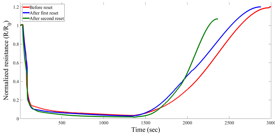 As shown earlier, the humidity sensor exhibits hysteresis, which increases with increasing number of cycles. To make the sensor more useful, it is imperative to “reset” the sensor by driving out the absorbed water molecules. In order to do this, the sensor, after exposure to 65% RH, is heated at 75˚C for 30 min. Figure 11 shows the response of the sensor before and after heating. The procedure is conducted twice to ensure that the sensor has repeatable performance even after a few reset cycles. The sensor shows similar response times before and after heating, as is clearly seen from the figure. Although the recovery response of the sensor changes slightly, the sensing response is fairly consistent.