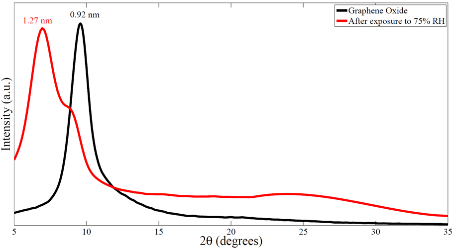 To confirm the increase in interlayer spacing after exposure to high humidity, X-ray diffraction spectra were obtained for the GO device exposed to 75% RH. Figure 13 shows a comparison of the X-ray diffraction spectra of GO before and after exposure. The interlayer spacing is increased from 0.92 nm to 1.27 nm. This increase in interlayer spacing, we propose, is due to the bonding between the dissociatedH2O molecules (H2O = H+ + OH−) and the C-OH and C=O groups of GO. The increase in interlayer spacing is also consistent with previous studies on the interlayer spacing of graphene oxide as a function of relative humidity [35] .