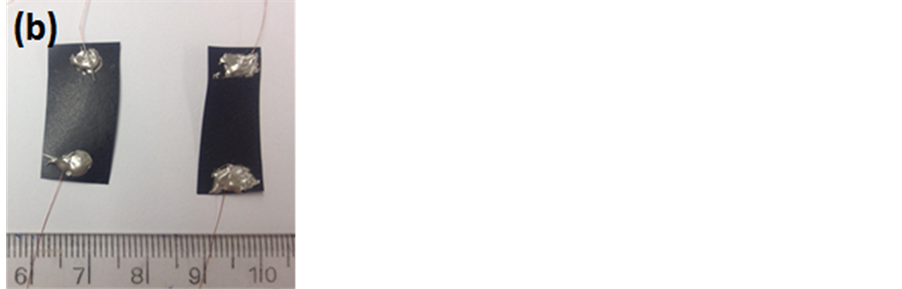 The humidity sensors were fabricated by cutting out 10 mm wide, 30 mm long rectangular samples from the GO papers obtained by filtration. From scanning electron microscope images, the thickness of the samples is obtained to be ~20 μm, as shown in Figure 1(a). Copper wires (diameter 0.12 mm) were bonded as electrodes to the GO samples using Circuit Works conductive epoxy, and left to dry overnight. Figure 1(b) shows some of the humidity sensing devices fabricated.