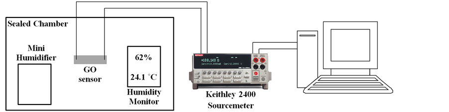 To characterize the performance of the fabricated graphene device as a humidity sensor, we measured the change in its resistance upon exposure to varying relative humidities inside the chamber. The resistance of the film was measured by applying a constant DC voltage of 1 V, and measuring the current. As illustrated in Figure 2, the graphene device is enclosed in a chamber (vol. ~9800 cm3) with the commercial humidifier and humidity monitor. The copper electrodes are connected to the Keithley 2400 source meter using alligator clips, which might introduce some contact resistance. A controlled test with a known resistance showed less than 0.1% variability on exposure to humidity. Thus, a change in contact resistance due to humidity is ruled out. The source meter is connected to a PC using a GPIB interface, where the data is acquired using LabVIEW. Figure 2 shows a schematic of the experimental setup. All experiments are carried out at room temperature (24˚C ± 1˚C).