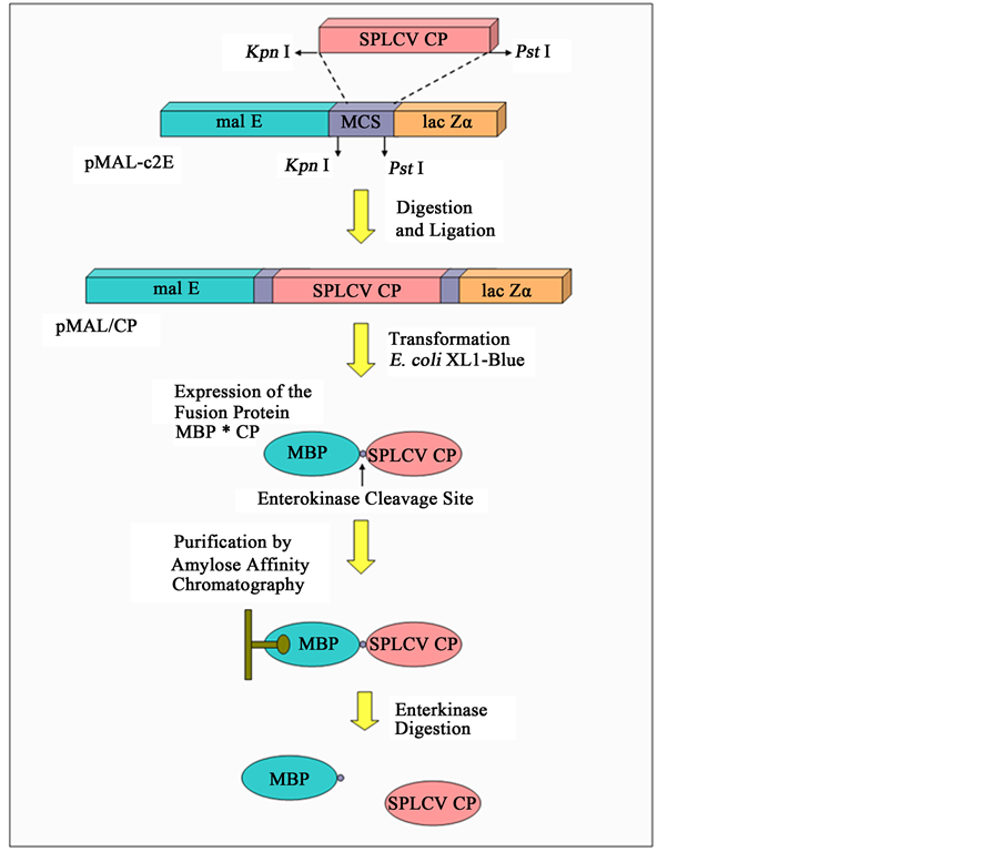 Figure 2. Diagram showing the expression in E. coli and purification of the fusion protein MBP *CP [Maltose-binding protein (MBP) and coat protein (CP) of Sweet potato leaf curl virus (SPLCV)]. MCS: Multiple cloning site in pMAL-c2E expression vector. mal E: gene encoding the MBP. lacZα: gene encoding the β-galactosidase α fragment.