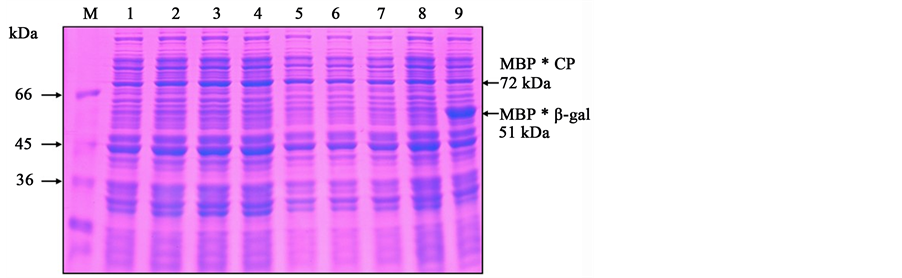 Figure 3. Time course study of the expression of the fusion protein MBP *CP [Maltose-binding protein (MBP) and coat protein (CP) of Sweet potato leaf curl virus] in an E. coli strain XL1-Blue. Cells were incubated in the presence of 0.3 mM IPTG at 26 ˚C. Induced cells harboring the recombinant plasmid pMAL-CP expressed the fusion protein MBP * CP (72 kDa), while induced cells harboring the pMAL-c2E vector expressed the MBP fused with the β-galactosidase α fragment protein (MBP *β-gal, 51 kDa). Total proteins were separated by 10% (w/v) SDS-PAGE and stained with Coomassie Brilliant Blue. Lane 1, non-induced cells harboring pMAL-CP. Lanes 2-7, induced cells for the duration of 15 min, 30 min, 1 hr, 2 hr, 4 hr, and 6 hr, respectively) harboring pMAL-CP. Lane 8, non-induced cells harboring pMAL-c2E. Lane 9, induced cells (2 hr) harboring pMAL-c2E. Line M, molecular weight marker.