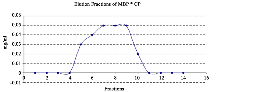 Fusion protein yields of 5 to 6 mg/liter of culture have been reported even when an expected protein band was not detectable after SDS-PAGE analysis (New England Biolabs, 2004). We decided to scale up to the one liter culture followed by purification of the fusion protein MAL *CP by the amylose-resin column affinity chromatography. After induction of E. coli XL1-Blue cells harboring the recombinant plasmid pMAL-CP, a 72 kDa polypeptide was purified from the crude protein extract of E. coli. The 72 kDa polypeptide was eluted from the amylose-resin column with 10 mM maltose (six fractions of 1 ml each) monitored by UV absorption at 280 nm (Figure 4, fractions 5 to 10; Figure 5, lanes 6, 7 and 8). This polypeptide was identified as the expected fusion protein based on its size 72 kDa on SDA-PAGE analysis, and its reaction with the Anti-MBP polyclonal antiserum by Western blot analysis. The 72 kDa polypeptide reacted with the polyclonal antiserum #1214 of tomato yellow leaf curl virus (TYLC) on Western blot analysis. Although this antiserum was not specific (it reacted with other bacterial proteins), it did not react with the MBP. Therefore, it is possible that some antibodies reacted with some epitopes of the SPLCV coat protein. Comparable expression levels of MAL fusion proteins with the β-galactosidase α fragment protein (MBP *β-gal, 51 kDa) (Figure 5, lane 3), and with the SPLCV coat protein (MBP *CP, 72 kDa) (Figure 5, lane 4) were observed after induction by 0.3 mM IPTG for one hr, suggesting that the SPLCV coat protein appears to behave as a normal passenger protein in this expression vector.