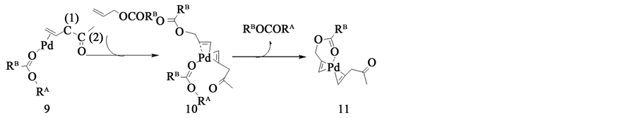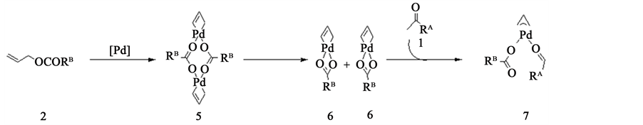 The reaction mechanism proposed by Tsuji and co-workers were shown in Scheme 4. In the first step of this reaction mechanism, Pd dinuclear complex 5 is formed to by catalyst and allylic ester. 5 is decomposed into two molecules, Pd mononuclear complex 6 is formed. 1 is close to 6, and intermediate 7 generates.